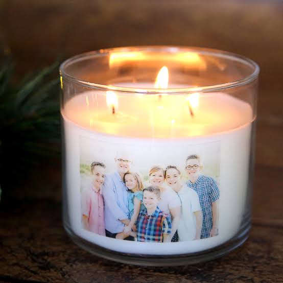 A beautiful scented candle that can be personalised with a photo/name/ message .